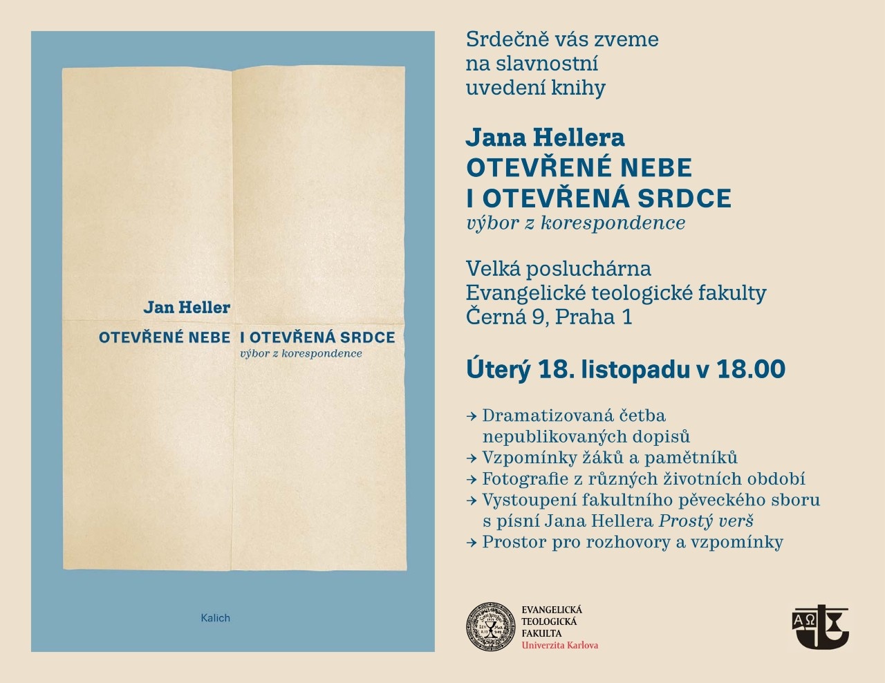 - Slavnostní uvedení knihy Jana Hellera Otevřené nebe a otevřená srdce – 18. 11. v 18 hodin, Velká posluchárna Evangelické teologické fakulty, Černá 9, Praha 1
