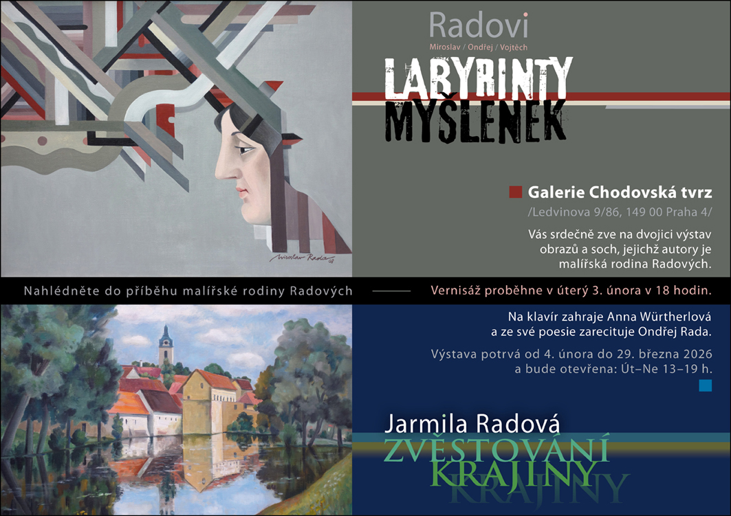 - Radovi – Labyrinty myšlenek a J. Radová – Zvěstování krajiny – dvojice výstav obrazů a soch rodiny Radových, Galerie Chodovská čtvrť, vernisáž 3. 2. v 18 hodin, výstava proběhne v termínu 4. 2. až 29. 2. 2026